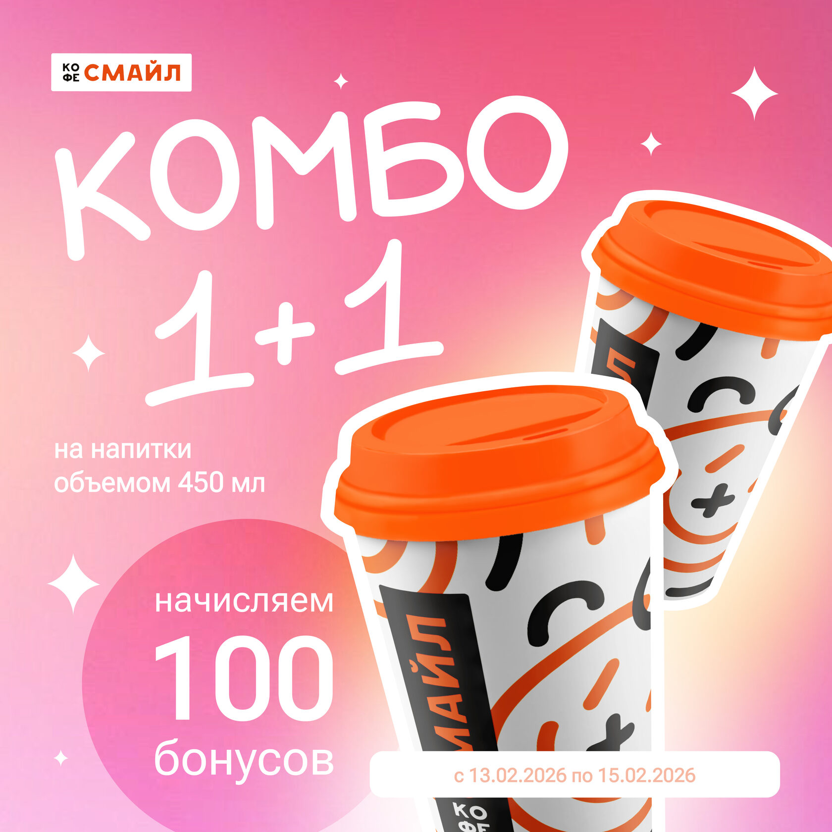 С 13 по 15 февраля в Кофе Смайл дарим 100 бонусов при заказе 2 напитков объёмом 450мл.