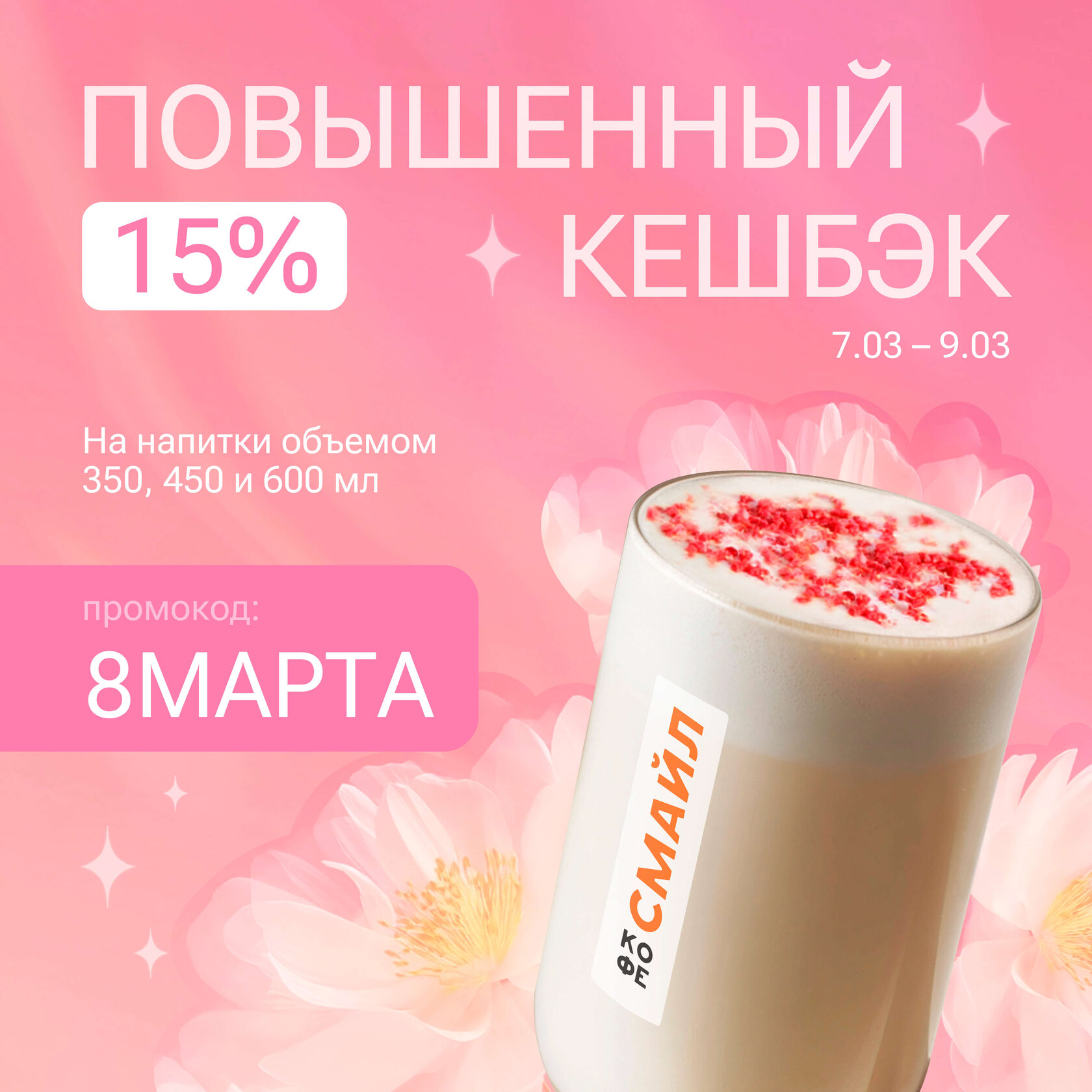 В честь праздника повышенный кешбек 15% с 7 по 9 марта НА ВСЕ НАПИТКИ.